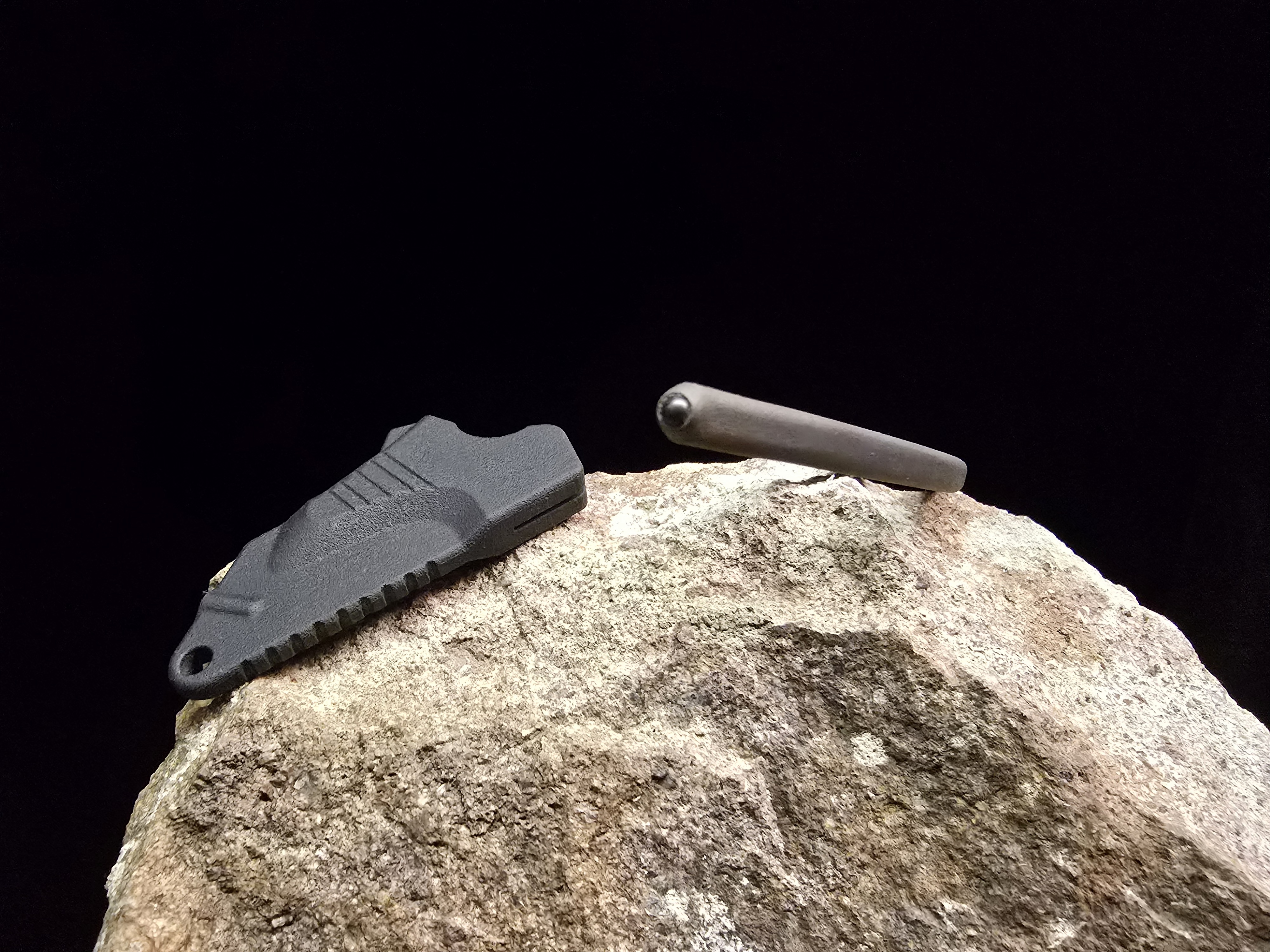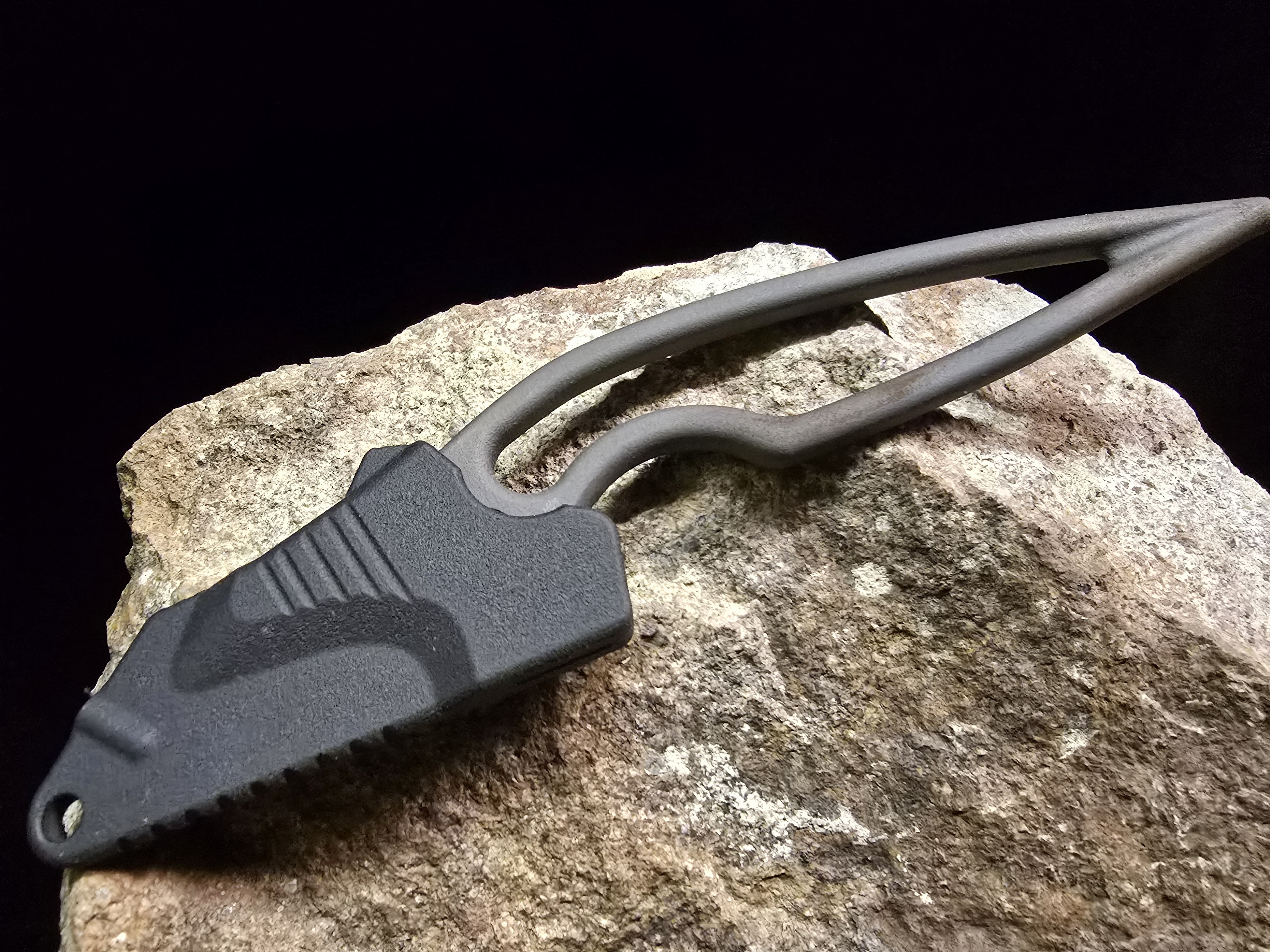 Dank des Wechselklingen-Systems steht jederzeit eine günstige, scharfe Klinge zur Verfügung – und bei Bedarf lassen sich die Klingen natürlich auch nachschärfen. Die 3D-gedruckte Scheide aus PA11 sorgt für sicheren Halt und ermöglicht das Tragen als Neckknife.